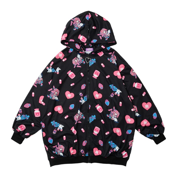Relaxed-fit, all-over print loose zip hoodie available in two colors: pink and black